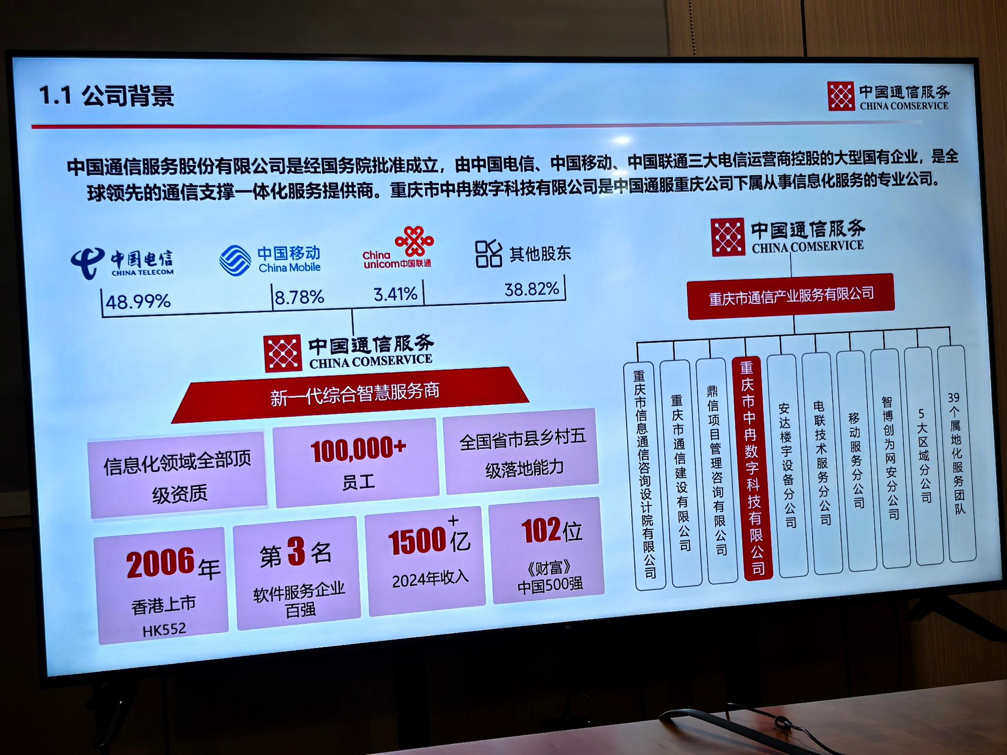 中冉公司数智物联部及低空应急行业负责人段崇禧详细介绍了公司背景、组织架构、团队规模、业务开展和最新技术场景应用等情况。中冉公司市场总监张大智介绍了公司市场拓展和场景应用落地情况。程总介绍了公司最新战略安排:中冉公司是重庆通服下属子公司,主要业务是软件研发(大数据、AI)、高端维保(XC运维)等,目前在低空经济领域开展了深入研究,其低空经济实验室是重庆市低空安全保障技术创新中心,目前在市应急局、市融办均有案例落地。
